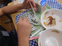 今日は、4年生が防災危機管理課からいただいた災害用アルファ化米でわかめご飯を作りを体験しました。パラパラとしたアルファ化米にわかめと水を8リットルほどいれて15分ほどおくと、食べやすい柔らかさになったわかめご飯ができあがりました。子ども達は、「おいしい!」と言って、たくさん食べていました。ただ、1セットは40~50人分あるそうで、全部食べるのは難しかったようです。他の学年は、給食室で調理したものをいただきました。災害用とはいえ、なかなかの美味しさでした。