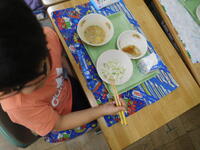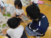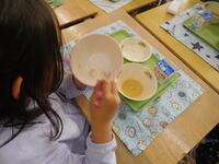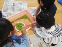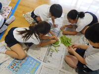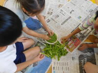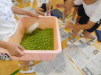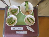 今日は、2年生がグリンピースの鞘むきを行いました。はじめに、栄養教諭の青柳先生からグリンピースについていろいろと教えていただきました。同じ仲間のことや、育ち方やむき方のコツなど子供たちは真剣にお話を聞いていました。いよいよ作業が開始です。さやが開く瞬間のポンという音を確かめ、中からきれいに並んだグリンピースが見えると「兄弟みたい!」「たくさん入ってる!」と話しながら、友達と協力して楽しく作業することができました。