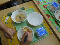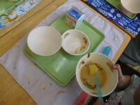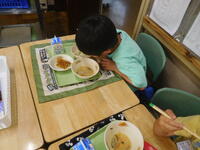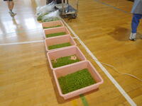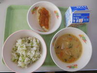2年生がむいたたくさんのグリンピースは、今日の給食のグリンピースご飯になって全校に届けられました。2年生は、自分たちがむいたグリンピースを「おいしい!」と言って、たくさん食べていました。