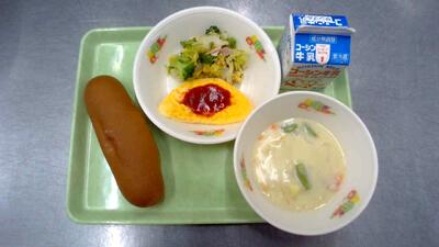 【献立】牛乳 黒糖パン オムレツ 温野菜のソテー アスパラと豆乳のクリームスープ