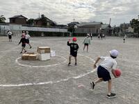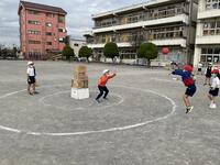校庭ではボール投げを行っています。キャッチボールや的当てをしたり、チーム対抗でゲームなどをしています。どうすれば的を倒せるかチームで作戦を練りながら、チームで頑張っている姿がとても輝いていました。