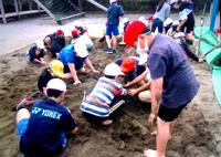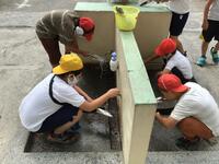 5年生は、理科の『流れる水のはたらき』の学習で、砂場で実験を行っています。