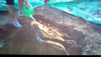みんなで作った山に水を流し、浸食や運搬、堆積の様子を観察しました。