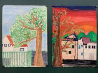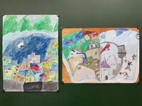 1組では木を、3組では電車を、4組ではコスモスを、5組では動物を描いています。