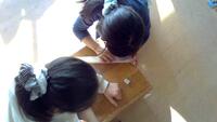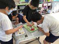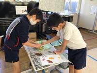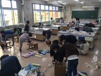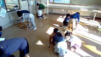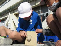 図工の「のこぎりひいて、ザクザクザク」の学習を行っています。のこぎりを初めて触る子供が多かったので、持ち方や切り方なども時間をかけて学習しました。最初は上手く使えず、木材を切るのに時間がかかっていましたが、慣れてくると友達と協力しながら木材を切ることが出来ました。この後は、切った木材をボンドではり付け、どんな形が出来るかを考えていく予定です。