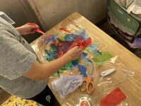 はさみで切ったり、ちぎったりして貼り重ねていくと、すてきな色や形が完成!