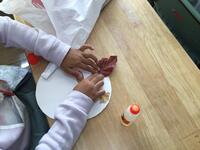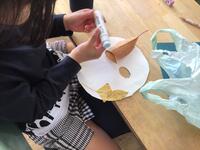 そして、校庭や中庭で拾った落ち葉を、お面のシートに貼り付けました。