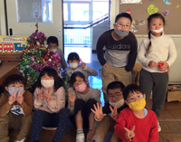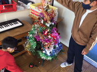 そこで、なかよしの教室もクリスマスの飾り付けをすることにしました。ツリーにオーナメントをつけて、雪に見立てた綿を飾り付けました。電飾が光ると、歓声をあげて喜んでいました。