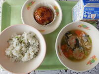 今日から給食が始まりました。昨日の給食委員からの発表でもあったように、今日の献立はおみくじハンバーグです。手作りハンバーグの中に、大きく切った こんにゃく、にんじん、れんこん が入れられていて、どれに当たるかで今年の運勢を占います。私は、れんこん が入っていました。運勢は…いいことが起きる?ラッキー運 だそうです。もりろん、運だけではなく、味も満点でした。