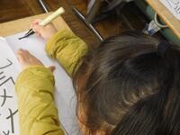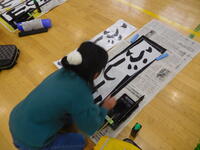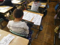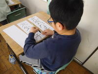 5時間目、2年4組でも席書会が行われていました。低学年は太いペンで大きな文字を書いていきます。皆、集中して作品を仕上げていました。