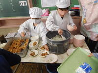 今日から1年生の給食が始まりました。たくさんの先生のお手伝いをいただきながら、給食当番のやり方や受け取り方などを学びました。待っている間は、お話をしないで静かに待つことや牛乳パックの開き方などたくさんのルールがありますが、徐々に覚えていけそうです。みんなとても上手に給食の準備ができました。美味しく食べられましたね。