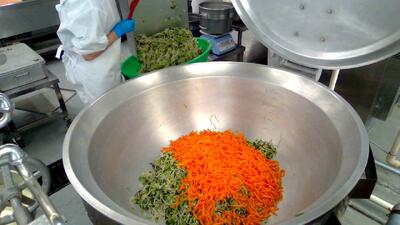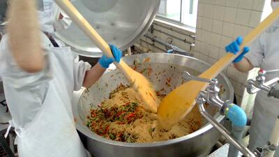 今日は、旬のアスパラと新じゃがを使ったグラタンです。ホワイトルウから手作りしました。出来た具を食缶に入れたら、粉チーズをふり、スチームコンベクションオーブンで焼き目をつけて出来上がりですグラタンは、子ども達からも職員からも好評でした。