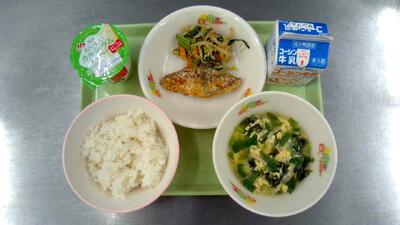 【献立】牛乳 麦ご飯 さわらの竜田揚げ 野菜のごま和え ニラ玉みそ汁 ヨーグルト