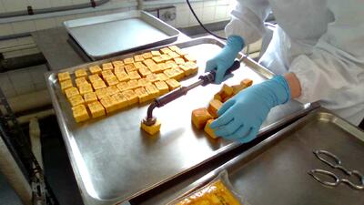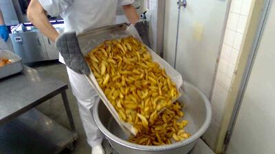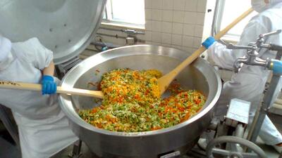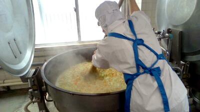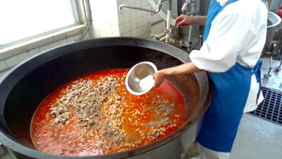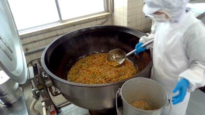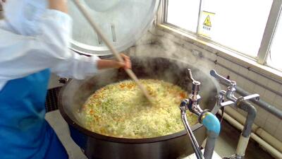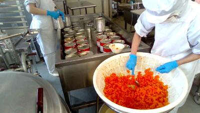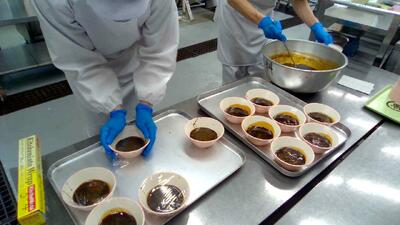 今日のフルーツのゼリー和えには、フルーツ缶(1号缶)を57缶、ゼリーはマスカット味を使用しました。調理員さんは、缶詰を開ける度に傷みや異物をチェックしていました。ゼリー和えはたくさんの子がおかわりしており、全体的によく食べられていました