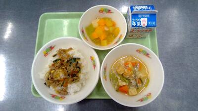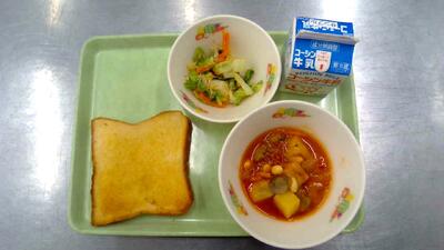 【献立】牛乳 レモンシュガートースト じゃこサラダ じゃがいもと豚肉のトマト煮