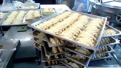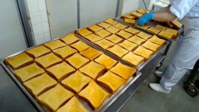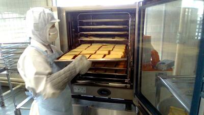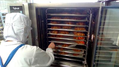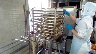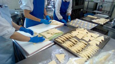 早朝、冷凍庫から必要な量の生地を取り出して解凍しました。生地は細長い三角形をしています。これを伸ばしながら丸めます。常温で1時間ほど置くと、生地が発酵してふんわり軟らかくなり、ひとまわり大きくなります。十分発酵した頃を見計らって、オーブンで15分焼きました。この見きわめが難しいようで、パン担当の調理員さんは霧吹きで水をかけて乾燥を防ぎ、釜の蒸気や熱を利用して発酵を促すなど始終つきっきりでした