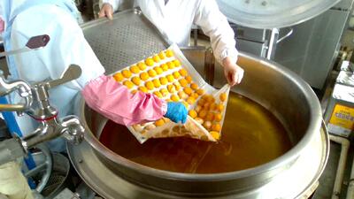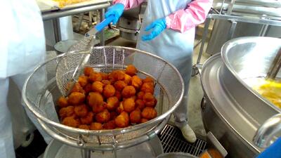 ピカロンは、かぼちゃやさつまいもをつぶして入れた、ペルーのドーナッツ菓子です。調理員さんは生地を丸めて、オーブンシートごと油に入れて揚げました。こうすることで、スピーディーに油に投入することが出来ます。