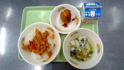 【献立】牛乳 チャプチェ丼 韓国風みそ汁 フルーツのゼリー和え