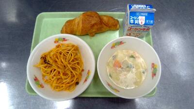 【献立】牛乳 ツナのトマトスパゲティ こぼれ梅と豆乳のクリームスープ クロワッサン