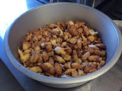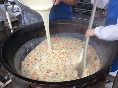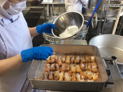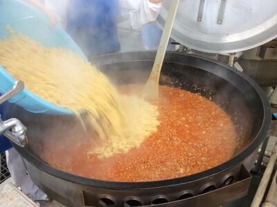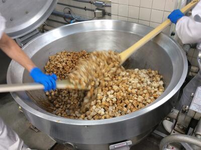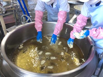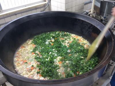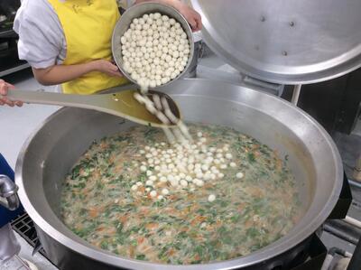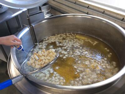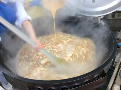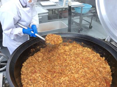 里芋は、片栗粉をうすくまぶして油で揚げ、赤みそやみりんで作ったみそだれをからめました。大量の里芋を揚げるのはなかなか大変でした片栗粉をまぶしてあるので、投入したまま放っておくと芋同士がくっついてしまいます。揚げ油に投入したら、すぐに網じゃくしでゆすり、パラパラになるようにしなければなりません。調理員さん2人で里芋81㎏を揚げ終わるまでに、2時間以上かかりました。
