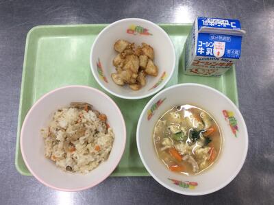 【献立】牛乳 ふきよせおこわ 里芋のみそがらめ むらくも汁