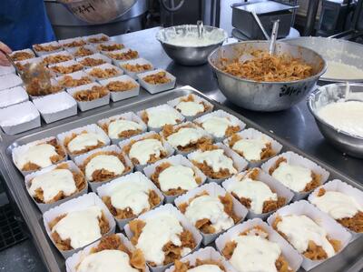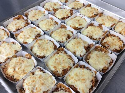 ラザニア風グラタンは、初登場の料理です。➀手作りミートソースにマカロニを混ぜたものと、②ホワイトソース、③とろけるチーズ④パン粉を順に重ねてカップに盛り付けました。その後、オーブンで焼き目をつけて出来上がりです。