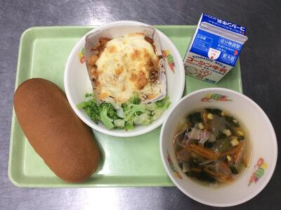 【献立】牛乳 コッペパン ラザニア風グラタン ゆで野菜 コンソメスープ