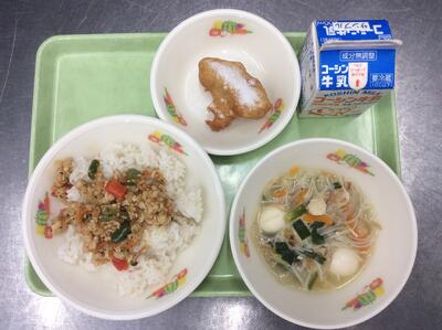 【献立】牛乳 鶏肉のガパオライス ビーフンスープ 揚げバナナ