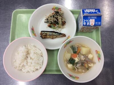 【献立】麦ご飯 秋刀魚の塩焼き 野菜ののり和え 豚汁