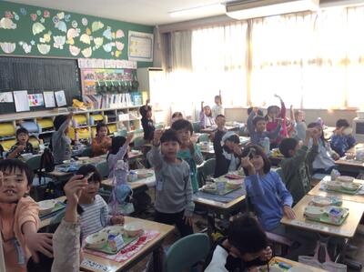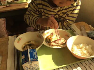 給食時間様子を見て回ると、1年生教室でも上手に骨を取り除けた子が何人もいました。魚がぼろぼろになってしまう子もいましたが、とにかくチャレンジすることが大事です。たとえ身が崩れても骨を取り出せただけでOKみんな頑張りました