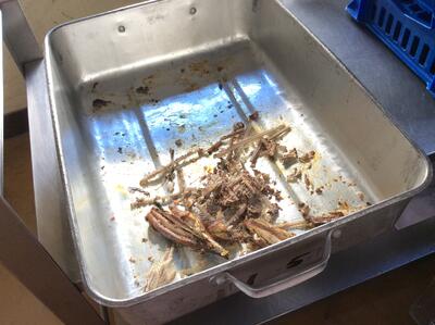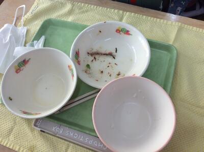 低学年の残渣の様子を見ると、里芋やおこわが残るクラスが見られました。一方で「ごはん美味しかった」「里芋美味しかった」と声をかけてくれる児童もいました