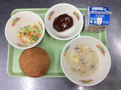 【献立】牛乳 ハンバーガー アーモンドサラダ 秋の香り豆乳シチュー