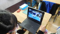 まずは、外国語活動です。今日は、いろいろな国の「こんにちは」の言い方を学習していました。アメリカやインド、韓国などの国々のカードを見ながら発音していきますが、子ども達はよく知っているようで、教わる前から「知ってる!」と楽しそうに話していました。また、動画を見ながらの練習では、前のめりになり食い入るように画面を見ていました。また、動画に合わせて、ぺこりと頭を下げたり、手を振ったりして楽しく活動していました。
