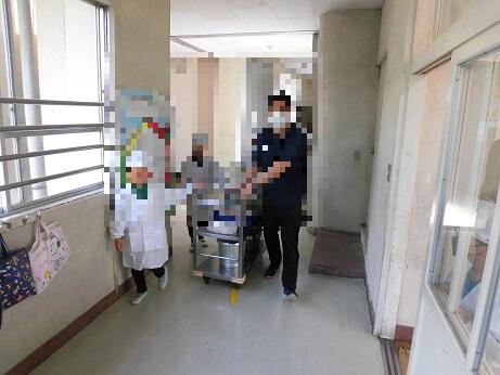 熱い食缶に特に気を配りながらワゴン台を移動して配膳しいよいよ「いただきます」。