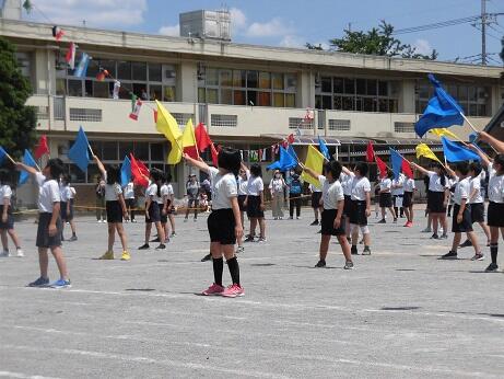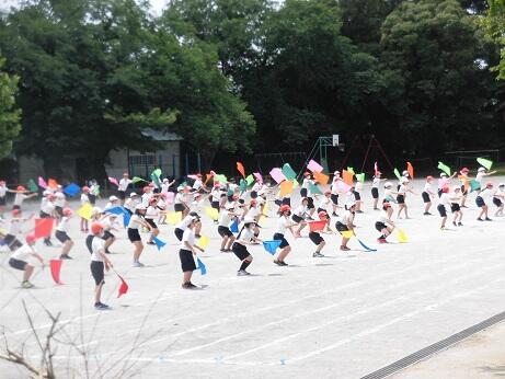 今週末の運動会に向けて5,6年生が新川小伝統のフラッグを使った表現の練習をしていました。