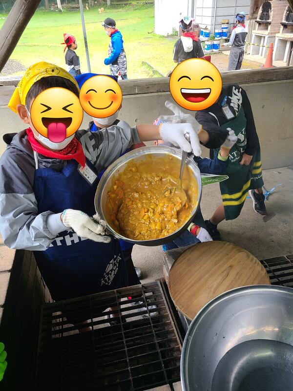 林間学園2日目はあいにくの雨模様となってしまいましたが、屋根のある野外炊事場でカレーライス作りをしました。