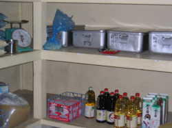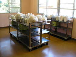 | 給食はワゴンにのせて各クラスに運ばれます。 | ワゴンを上の階に上げるリフトです。 | お米、麦、調味料など日々使う物を在庫しています。 |