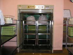 | 洗浄の終了した食器や食缶などを、約100℃の熱風で乾燥、消毒します。 | 同じく熱風で乾燥、消毒しますが、こちらは主ににざるなどの調理器具を入れています。 | おいしくて、安全な給食をめざして日々努力しています。 |