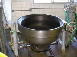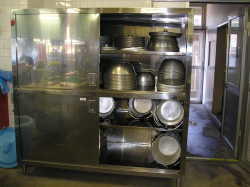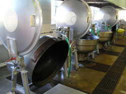 | とても大きなお釜で給食をつくります。ハンドルを回すと前後に傾きます。 | 給食室には4釜あります。ゆで物、煮物、蒸し物、揚げ物など作っています。 | 日々使用ボールや食缶などを衛生的に保管する所です。 |