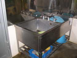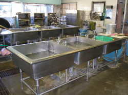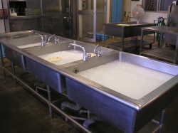 | このシンクは泥のついた野菜など主に洗う、下洗い用のシンクです。 | この中で果物、野菜を洗いますが、流水で3回以上洗浄します。 | 使用した調理用品や食器などを洗浄する三槽シンクです。 |