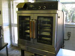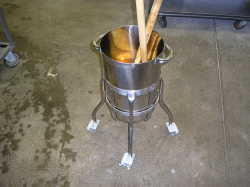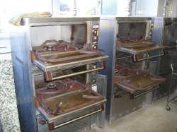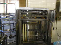 | 一度に魚なら300枚程度焼くことの出来る大量調理用のオーブンです。 | 大型のしゃもじ立てです。しゃもじは、人の背丈ぐらい大きいので置く所にも困ってしまいます。 | じゃが芋、根菜類を効率よく、短時間で洗いながら皮むきを行います。洗濯機のような物です。 |