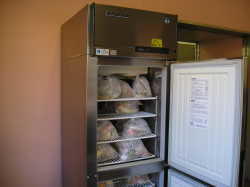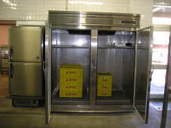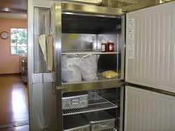 | 牛乳専用の冷蔵庫です。いつも5℃以下になるようにされています。 | その日に納品された食品を一時的保存する冷蔵庫です。主に肉製品などを入れ冷やしておきます。 | その日に使用した食品すべてと出来上がった料理を-20℃で2週間保存しています。 |