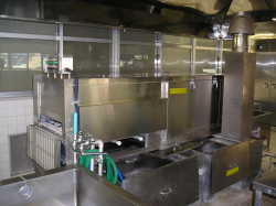 | マイコン制御のガスの炊飯器です。1釜でお米7kg炊くことができます。 | 洗浄後のまな板と包丁を殺菌し、保管しています。 | 使用した食器を熱湯と水流で洗浄します。 |