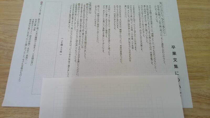こんにちは3-2組広報委員会です。今は3年生は入試に向けて必死になって勉強をしていたりと今すごく忙しい時期になっています。そんなことで、今回は卒業までということで今日の6時間目に卒業文集を書き始めました。皆さんは卒業文集にどんなことを書きましたか?私は、作文がとても苦手で何を書けばいいかわからない状態になっていました。雑談になりますが、受験シーズン中の風邪の予防でしっかり手洗い・うがいをしましょう!(先日、私はインフルエンザにかかってしまって3日間ほど何もできませんでした・・・)