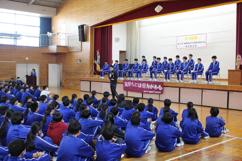 報告会では、選手一人ひとりが大会を振り返っての思いや支えてくれた方々への感謝をし、全校生徒から大きな拍手が送られました。