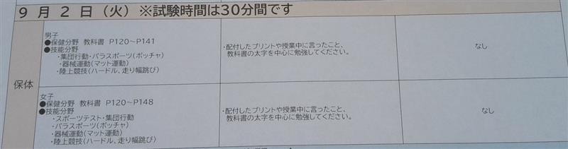 夏休みが明けてすぐ、前期期末テストが始まりました。初日の今日は保健体育のテストが実施されました。
