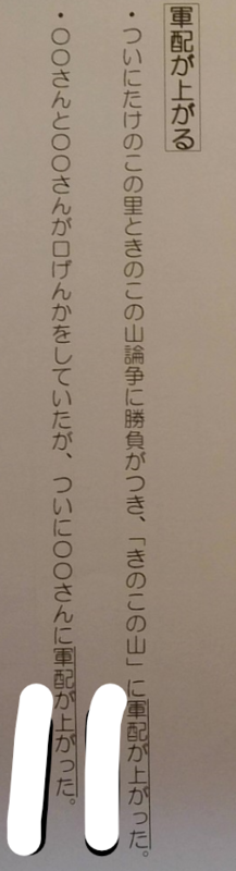 実は最近、国語の授業で「漢字辞典で調べた例文で、一番上手だった人の文をプリントで配る」というものがありまして、そこでこのクラス、2組のIさんが「ついにたけのこの里ときのこの山論争に勝負がつき、「きのこの山」に軍配が上がった」という分で見事プリントに掲載されました。