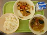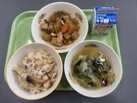 牛乳 わかめごはん 厚焼きたまご じゃがいものそぼろ煮 根菜のごまみそ汁