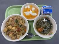 マーボー豆腐丼 白菜とわかめの中華スープ フルーツのヨーグルトあえ 牛乳
