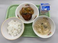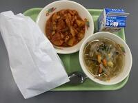 今日は南流山中の2年2組の生徒が考えた献立です。献立名は「健康に良い!献立」、PRポイントは「1食で食品群別摂取量の1/3をなるべく目指して、バランスの良い食事になるようにし、おいしく食べられるようにしました。」とのことです。中学生だけでなく、大人にも好まれそうな、おいしくバランスの良い献立になっていますね。しょうが焼きに、豚肉だけではなく、野菜も入っているところが良かったです。食品群別摂取量とは、5大栄養素のうち、どの栄養素を多く含むかで食品を6つのグループに分けたものを、それぞれどれ位食べたら良いのかを示したものです。例えば、体をつくるもとになる、たんぱく質を多く含む食品である魚や肉などは1群、体の調子を整える、骨や歯の材料となる無機質を多く含む食品である乳製品や小魚は2群、というように分類します。採用された献立は、6つのグループをバランス良く取り入れられているという所も特徴の一つです。色々な食材に注目して食べましょう。明日は、和食の丼もののため、スプーンがつきますが箸があるとより和食らしく食べることができます。必要な人は各自持参してください。